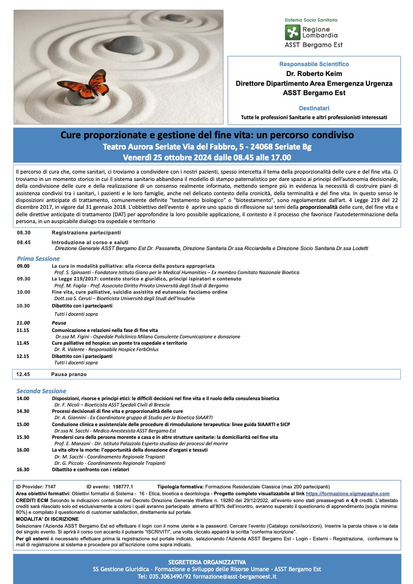25 Ottobre 2024 – Cure proporzionate e gestione del fine vita: un percorso condiviso (Teatro Aurora, Seriate)