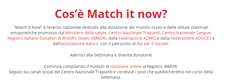 15/092021 MATCH IT NOW! 18-25 SETTEMBRE 2021 — di CRT Dal 18 al 25 settembre p.v. torna la Settimana nazionale per la donazione di midollo osseo MATCH IT NOW dedicata a Tutti coloro vogliono saperne di più ed iscriversi come potenziali donatori al Registro IBMDR Brochure MATCH IT NOW 2021