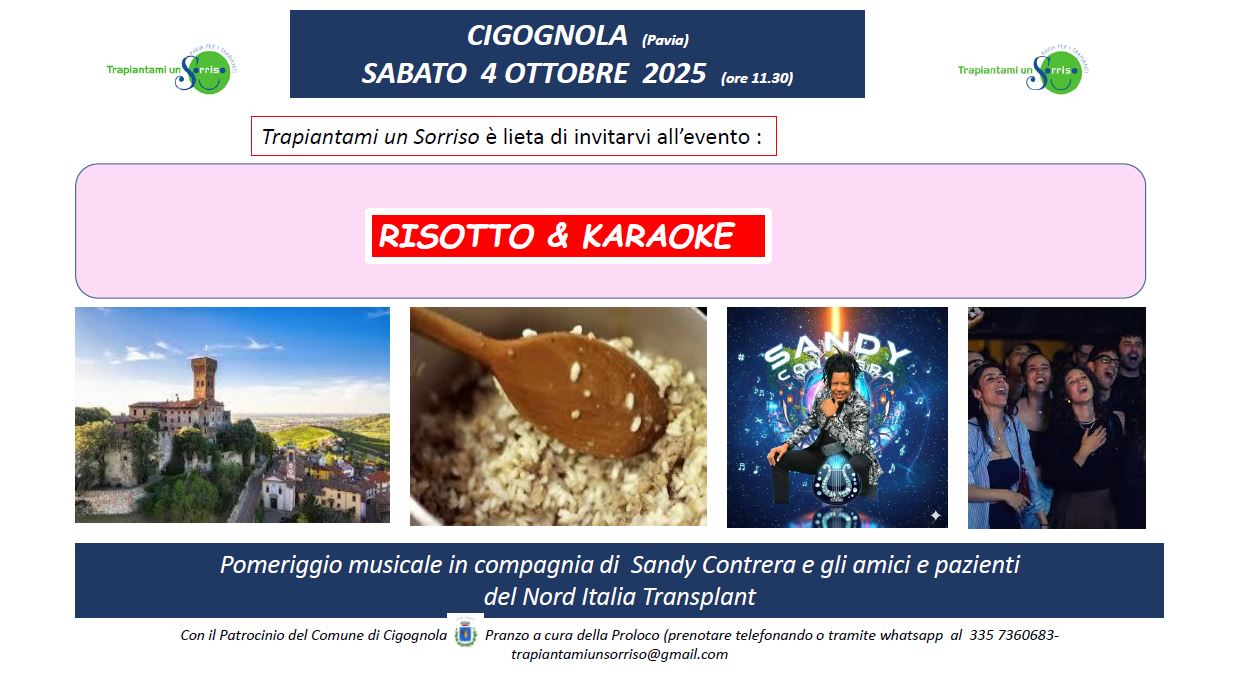 02/102025 “RISOTTO & KARAOKE” Comune di Cigognola (PV) il 4 ottobre 2025 proposto da TRAPIANTAMIUNSORRISO — di CRT Comunicazione
